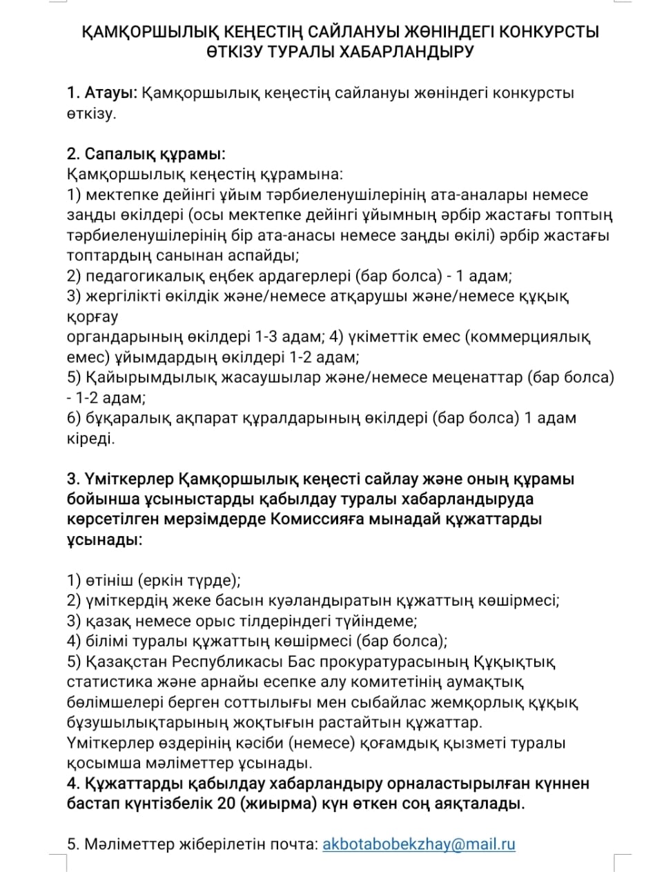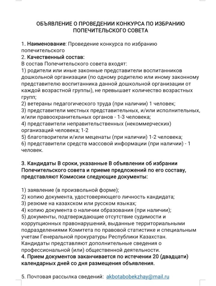 Қамқоршылық кеңестің сайлануы жөніндегі конкурусты өткізу туралы хабарландыру