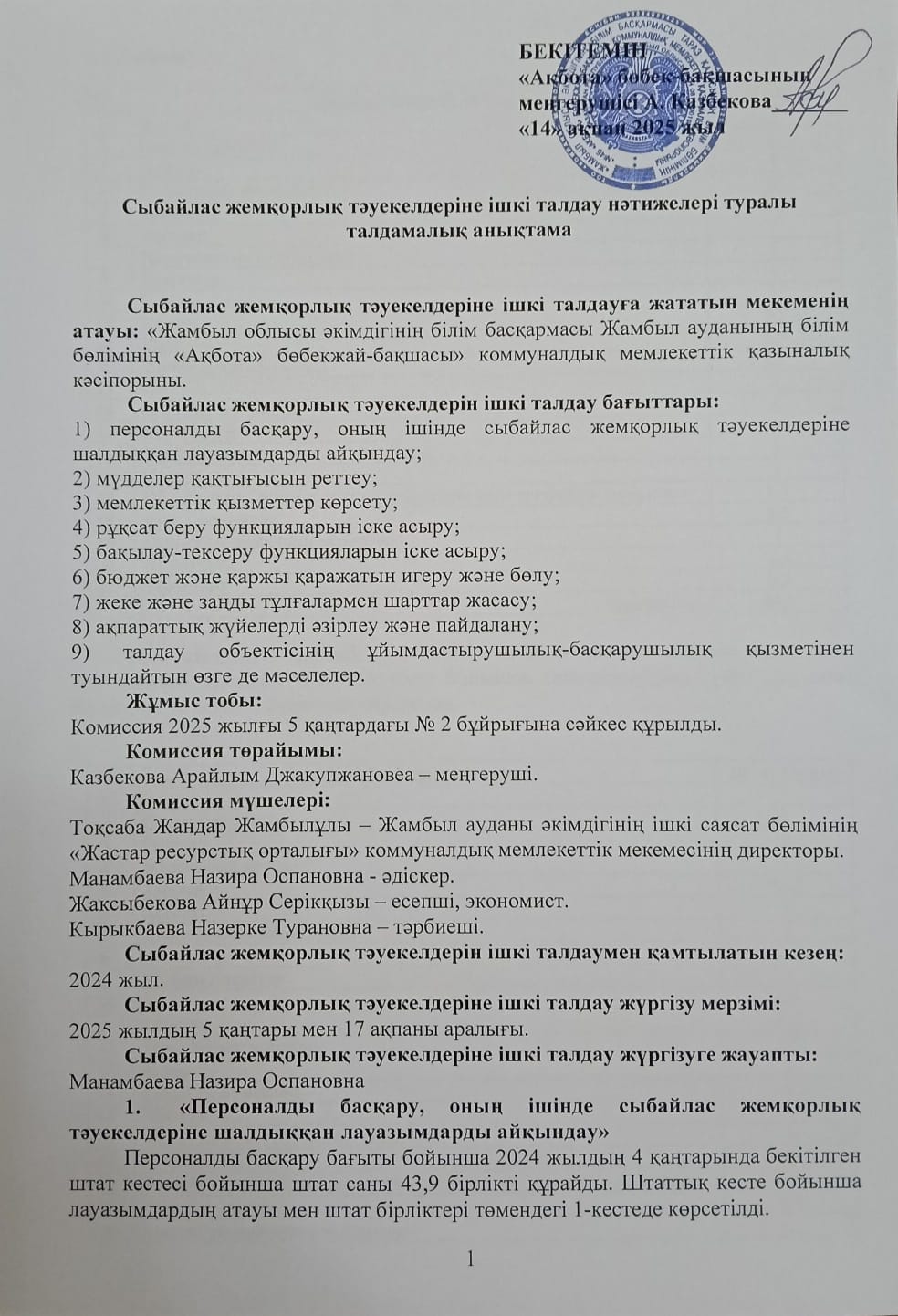 Сыбайлас жемқорлық тәуекелдеріне ішкі талдау нәтижелері туралы талдамалық анықтама